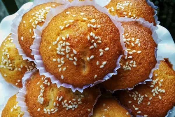 حالا می توانید در صورت تمایل کمی کنجد یا مغز پسته و یا هر دو را روی سطح کیک ها بریزید.